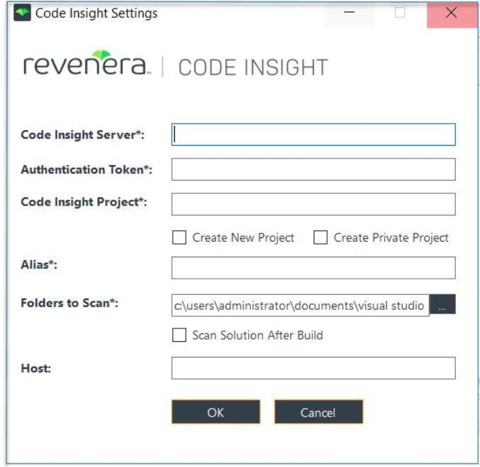 Field Description Code Insight Server Enter the URL for the Code Insight core server in the format http://<SERVERHOSTNAME>:<PORT>/codeinsight/(for example,http://codeInsightServer.myorg.org:8888/codeinsight/). Ensure that the URL is publicly accessible and that the port is available.Authentication Token Provide the JSON Web Token (JWT) used to authorize user access to the Code Insight functionality. You generate this token using the Code Insight Web UI and then copy and paste it in this field. For more information, see Providing an Authorization Token. Code Insight Project Enter the name of the Code Insight project that already exists or that you want this configuration process to create on the Code Insight server to store scan results. If you want the configuration process to create the specified Code Insight project, select Create New Project (see the next table entry). If the specified project already exists on the Code Insight server, do not select Create New Project or Create Private Project (see the next table entries). Create New Project Select this option if you want the configuration process to create a project in which to store scan results on the Code Insight server. The project is the name specified for Code Insight Project. The Project Owner is the user who generated the JWT provided for Authentication Token. If you want this new project to be public—that is, viewable by all Code Insight users—leave the next option, Create Private Project, unselected. Otherwise, select Create Private Project (described next). Create Private Project Select this option if you selected Create a New Projectand want this new project to be a private—that is, accessible by only the Project Contact and users assigned to project roles. The Project Contact is the user who generated the JWT provided for Authentication Token. Leave this option unselected if you want the new project to be public. Alias A name that you define for the scan-agent plugin. The alias is used to represent the "container" (scan root) under which all the files scanned in this instance will be listed in the API output and in the file tree in the Analysis Workbench. This name must be unique within the project. Folders to Scan The auto-generated list of codebase folders to scan, based on the current output configuration of the Visual Studio project. To append additional codebase folders to scan, specify their absolute paths, separating each with a comma.