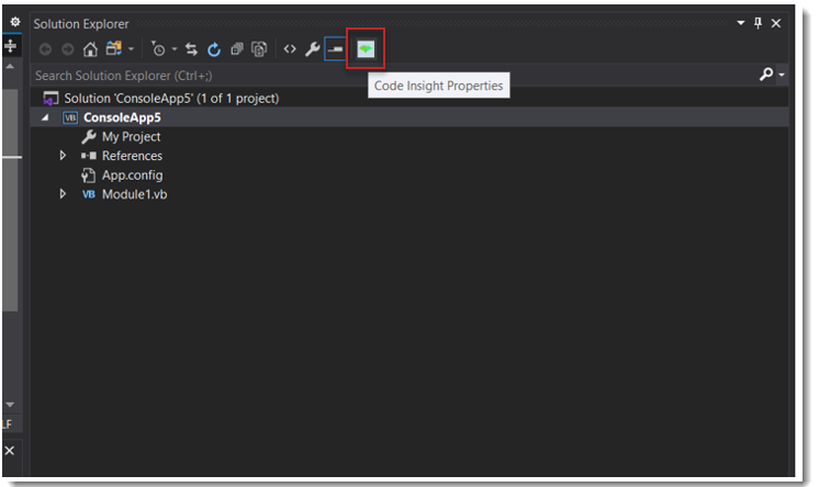 During the Visual Studio plugin installation, the Code Insight Properties icon is added to the Solution Explorer toolbar in Visual Studio IDE. This icon provides access to the settings needed to configure the plugin at the solution level.