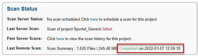 To view the status of the import of scan results into your Code Insight project from the most recent remote scan run for your project, navigate to the project’s Summary page. In the Scan Status section, locate the status and timestamp of the import. (For a description of these remote-scan details, see the "Summary Tab" topic under "Code Insight User Roles and Permissions" section in the Code Insight User Guide.)