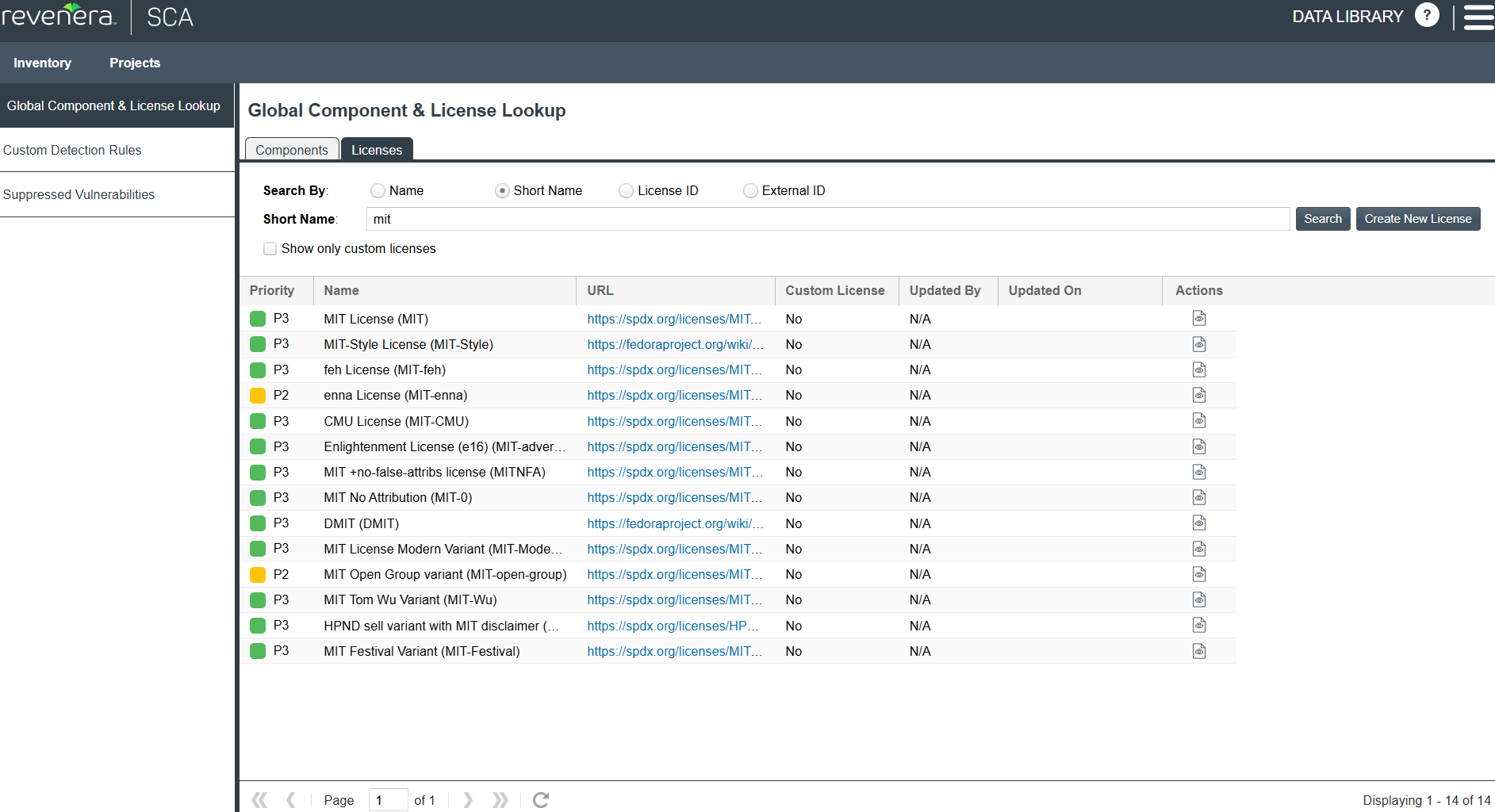 Once you have performed a successful search of licenses (the setup of which is described in Setting Up a Global License Search), the results are listed in a grid below your search criterion on the Global Component & License Lookup > Licenses tab. (For a complete description of the details shown for the licenses in these results, see Licenses Tab.)