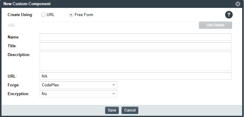 If the forge you entered is not one of the supported domains, the New Custom Component window opens, showing the Forge field automatically populated with the forge type you selected.