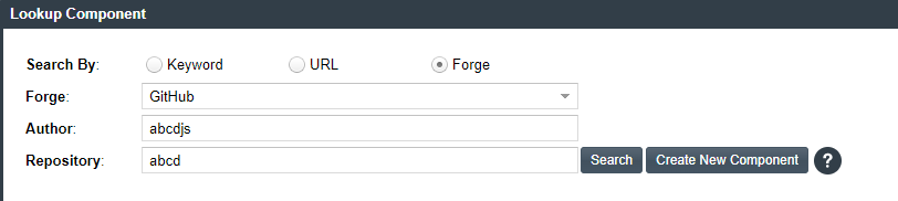 Selecting the Github option from the Forge field drop-down enables you to access the Author and Repository fields that helps you to search for a specific component within the forge by entering required details.