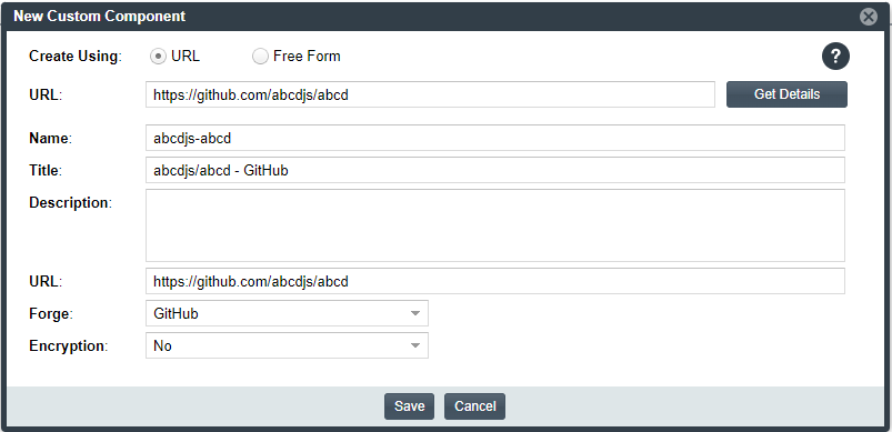 If Code Insight does not recognize the URL as belonging to a supported domain (that is, it is unable to parse the URL), the New Custom Component window opens showing the URL only. You must click Get Details to complete the component fields manually in Free Form mode. (Click OK on the "Unable to parse URL..." message box to proceed to Free Form mode.)