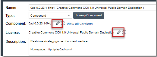 In the Inventory Items list in Project Inventory, select the inventory item associated with the component version for which you want to identify the user-preferred license, and then click the Edit Item button to open the Edit Inventory window. Or