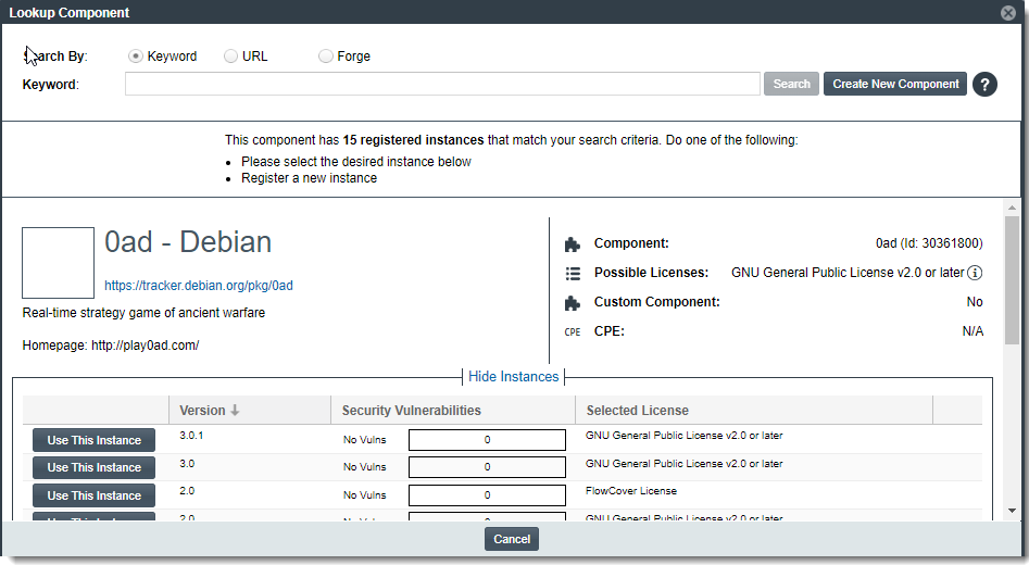 On the Lookup Component window, click Show Versions to display a grid showing registered instances of component versions and their mapped licenses for the component.