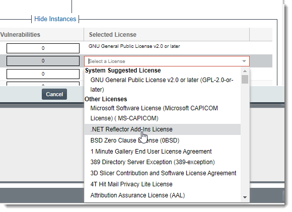 From the License dropdown, select the license that you want to identify as the user-preferred license. Be sure that you select the license from an appropriate license category on the dropdown, as described in License Selections Allowing Access to the "Update License Mapping" Window to ensure that Update License Mapping window will be opened. Alternatively, click New to create a custom license to map to the component version. Once you have defined the license on the Create Custom License window, click OK to return to the Edit Version/License window.