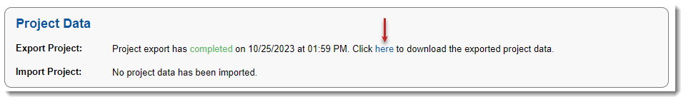 noteIf no export was previously run on the project, the Export Project field shows "No project data has been exported", and consequently no link is available. This same message is also displayed for projects in a Code Insight 2023 R4 or later instance that has been upgraded, but the