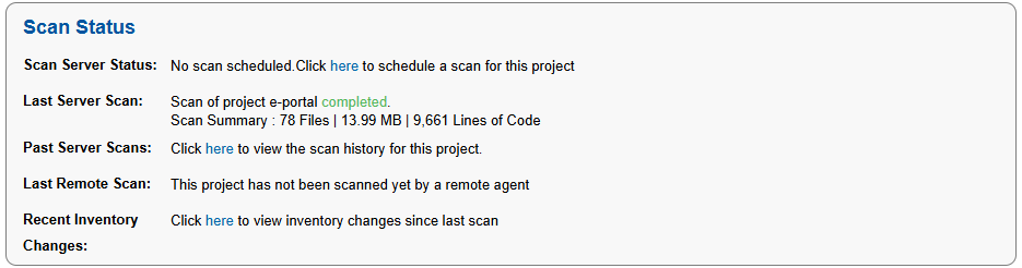 The Scan Server associated with the project is disabled for scanning—If no scan is scheduled or running for the current project, check with the Code Insight System Administrator to determine the status of the Scan Server. If it is disabled, you will need to create a new project for the codebase and associate it with an enabled Scan Server. (The Start Scan button and the "here" link in the Scan Server Status field should still be enabled if the Scan Server is only temporarily inactive.)