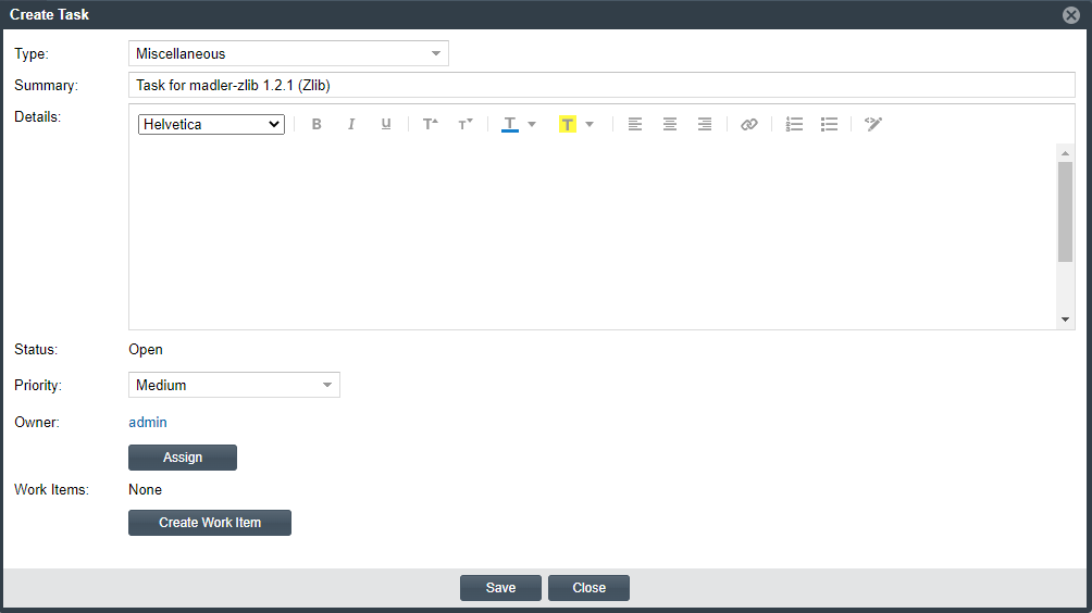 A task can also be created automatically in an automated workflow process (along with external work items) based on review and remediation options up for the project, as described in Updating Inventory Review and Remediation Settings for a Project. Users with proper permissions can then manage these tasks and manually created tasks, using the procedures described in this section.