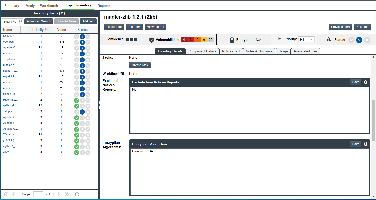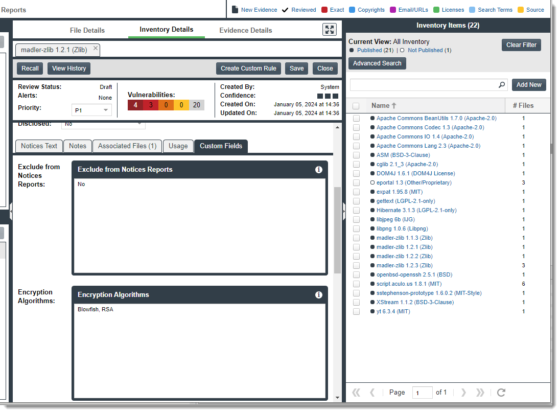 The following example shows two custom fields (Exclude from Notices Report and Encryption Algorithms) on the Inventory Details tab within the Project Inventory Details pane for the selected inventory item on the Project Inventory tab.