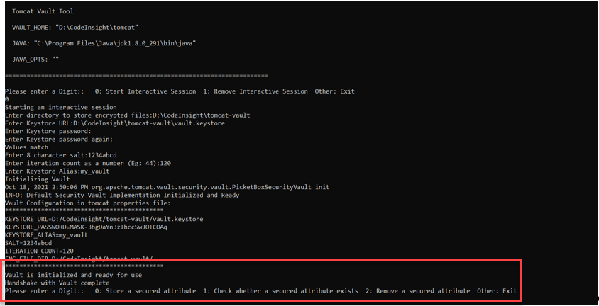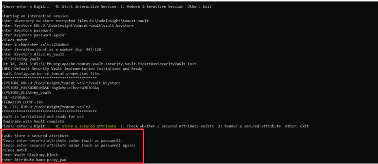 vault.bat --keystoreD:\CodeInsight\tomcat\tomcat-vault\vault.keystore--keystore-passwordpassword123--aliasmy_vault--enc-dirD:\CodeInsight\tomcat\tomcat-vault--iteration120--salt1234abcd--generate-configD:\CodeInsight\tomcat\conf\vault.properties--vault-blockmy_block--attributeproxy_pwd--sec-attrsca