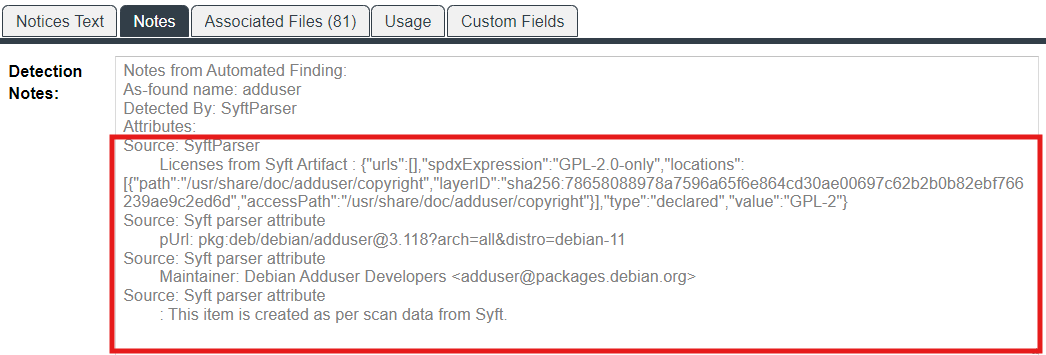 The Notes field can include other Syft parser attributes as well, as shown in this example: