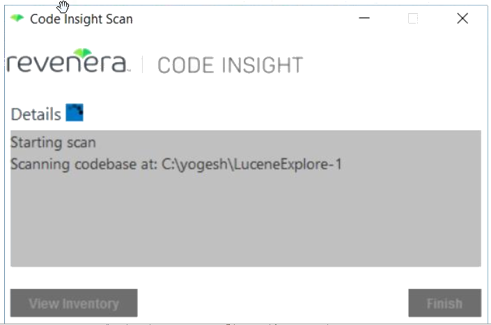 - Click View Inventory to connect to Code Insight, which opens to the Project Inventory tab for the project created for the scan. From here you can review, manage, and remediate the inventory resulting from the scan. For further instructions, refer to "Reviewing Published Inventory" in the "Using Code Insight" chapter in the Code Insight User Guide.