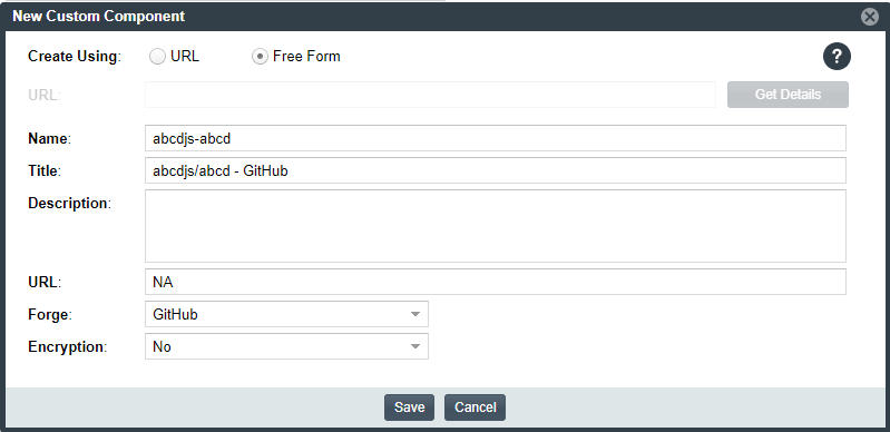 If the forge you entered is not one of the supported domains, the New Custom Component window opens, showing the Forge field automatically populated with the forge type you selected.