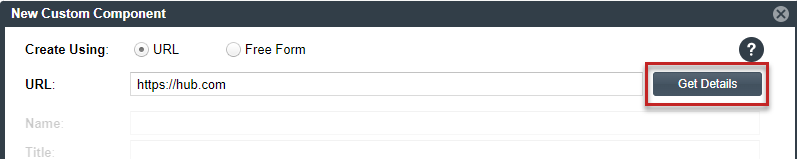 If Code Insight does not recognize the URL as belonging to a supported domain (that is, it is unable to parse the URL), the New Custom Component window opens showing the URL only. You must click Get Details to complete the component fields manually in Free Form mode. (Click OK on the "Unable to parse URL..." message box to proceed to Free Form mode.)