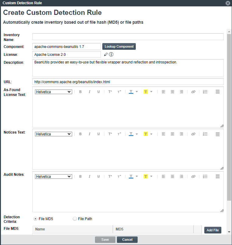 Update the populated information if necessary and provide values for the blank As-Found License Text, Notices Text, and Audit Notes fields as needed. (For a description of each field, refer to Create Custom Detection Rule Dialog.) The information provided in these fields defines the inventory created or updated by this rule in future scans. Note that you can use the Inventory Name field to overwrite the default name component version (license) otherwise assigned to inventory items created by this rule.