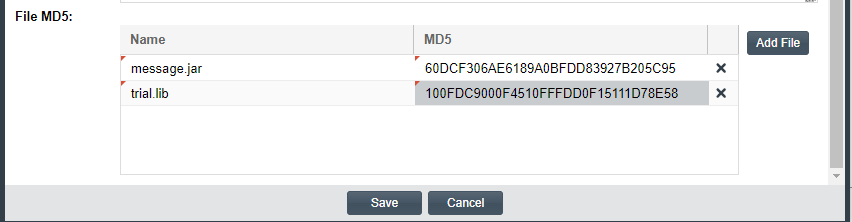 For each file criterion you want to add for detecting the component, click the Add File button and provide the file’s name and MD5 value in the new row in the grid.