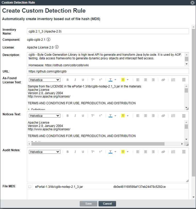 Code Insight enables you to create a custom detection rule based on the file criteria of the inventory item that you had to create or update. Because you are creating this rule within the context of an existing inventory item, most of the fields that define the rule are pre-populated with details from the item, including the MD5 value for each file currently associated with the inventory item.