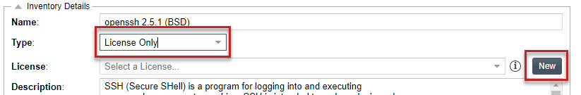 Generally you create a License Only inventory item if you know the license for the third-party code or artifact but do not know the component. (You can later edit this inventory item to convert it to one of the other inventory types.) This type of inventory is typically used for groups of files of unknown origin that are governed by a specific license. When you select the license, the inventory name is automatically generated as Files under <LICENSE NAME> License.
