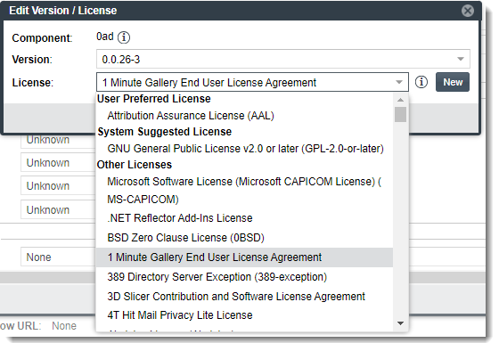 | User Preferred and System Suggested License | A license (previously classified as System Suggested License ) that a user has specified to be mapped to all future inventory that the system generates across projects for the component version. |