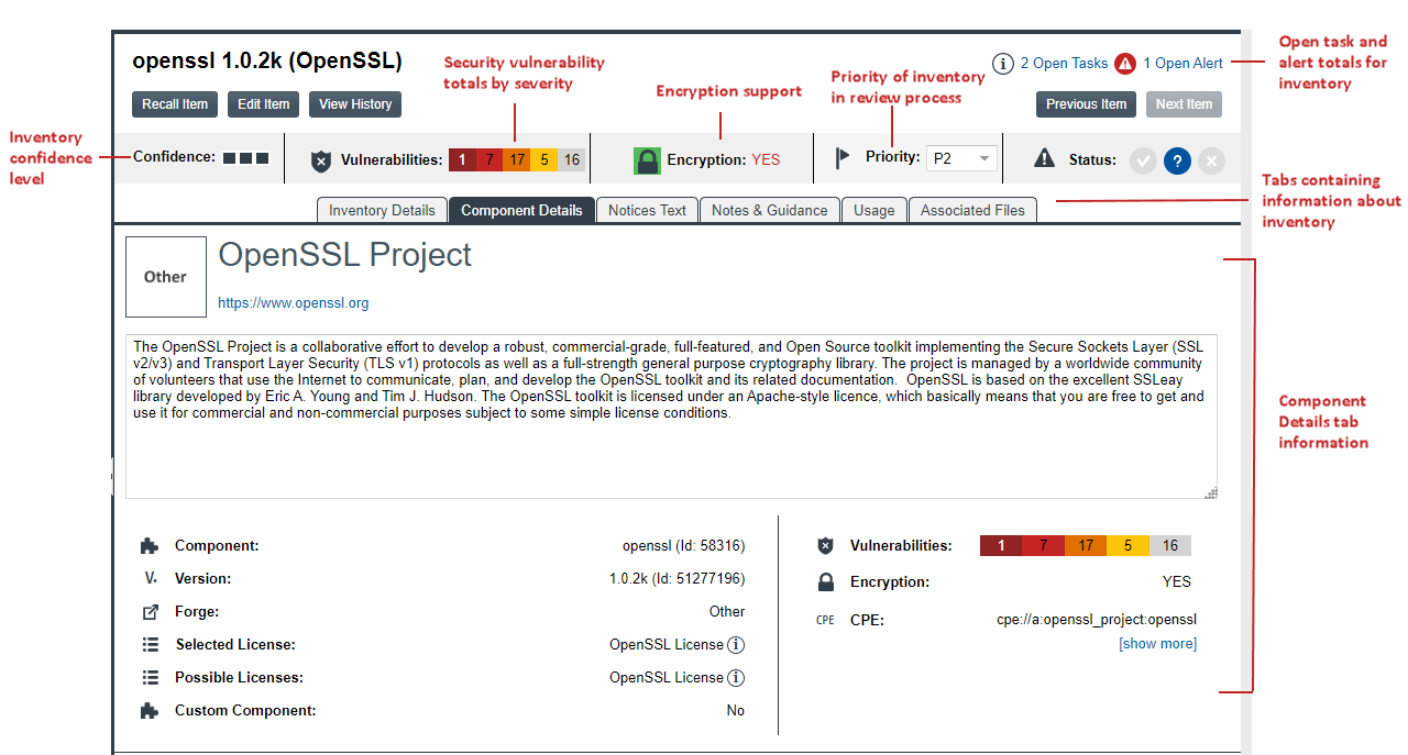 An inventory item typically has an associated component, version, license and list of security vulnerabilities, as well as other details about these elements. See Inventory Details Tab in the Analysis Workbench for a full description of the information collected by the scan.
