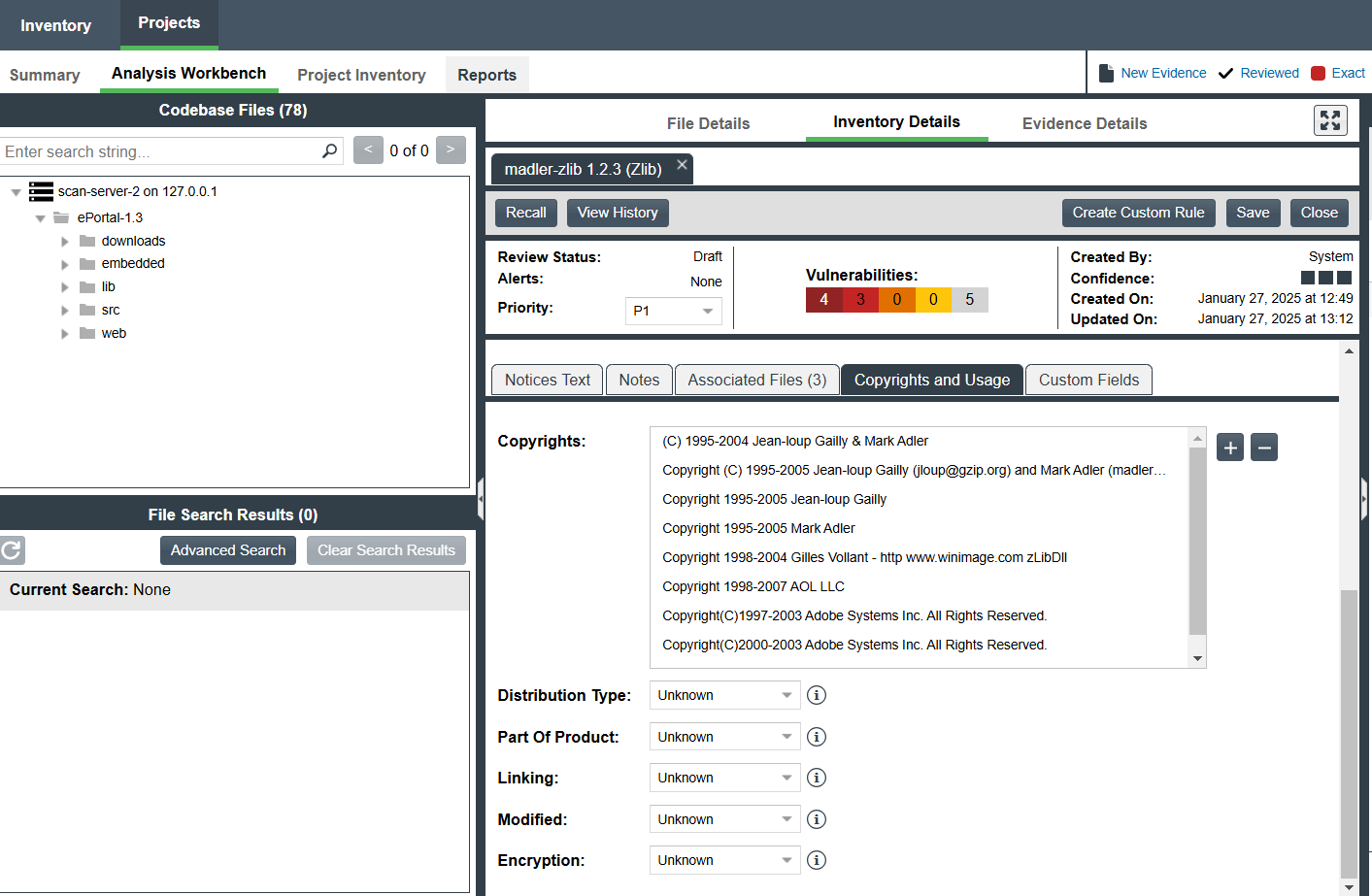 If a codebase scan or rescan identifies updates or additions of open-source or third-party copyrights for an inventory item, the corresponding Copyrights field is updated accordingly. This field reflects both newly added or updated copyrights along with previously existing ones.