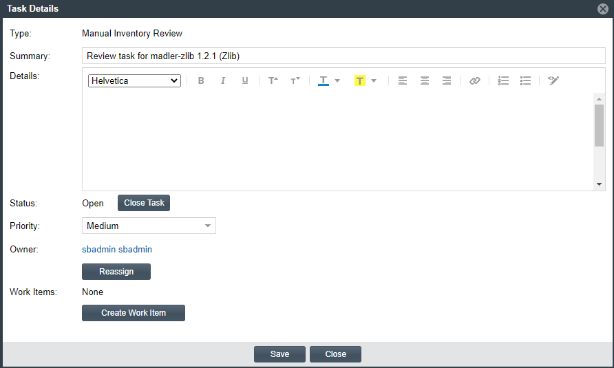 If the task type is Remediate Inventory or Miscellaneous, the task is immediately closed. Closing either of these tasks types has no effect on the current status of the inventory item. If you need to change the inventory status upon closing the task, do so manually.