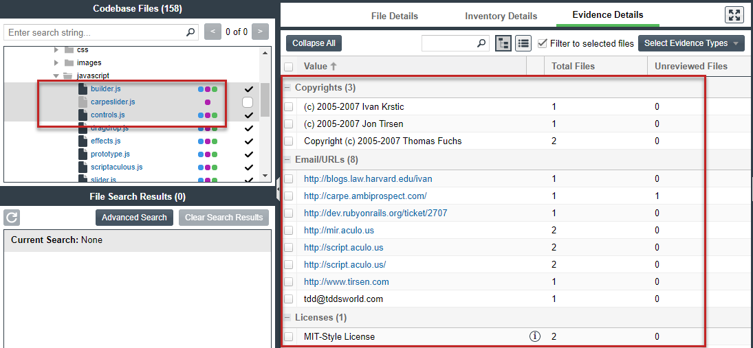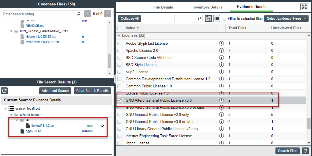 The associated files are listed in the Files Search Results pane. (You can also select multiple evidence instances in this step.) For more details about using the Evidence Details tab, see Examining Evidence of Open-Source Copyrights, Email Addresses, URLs, Licenses, and Search Terms in a Given Non-Binary File.
