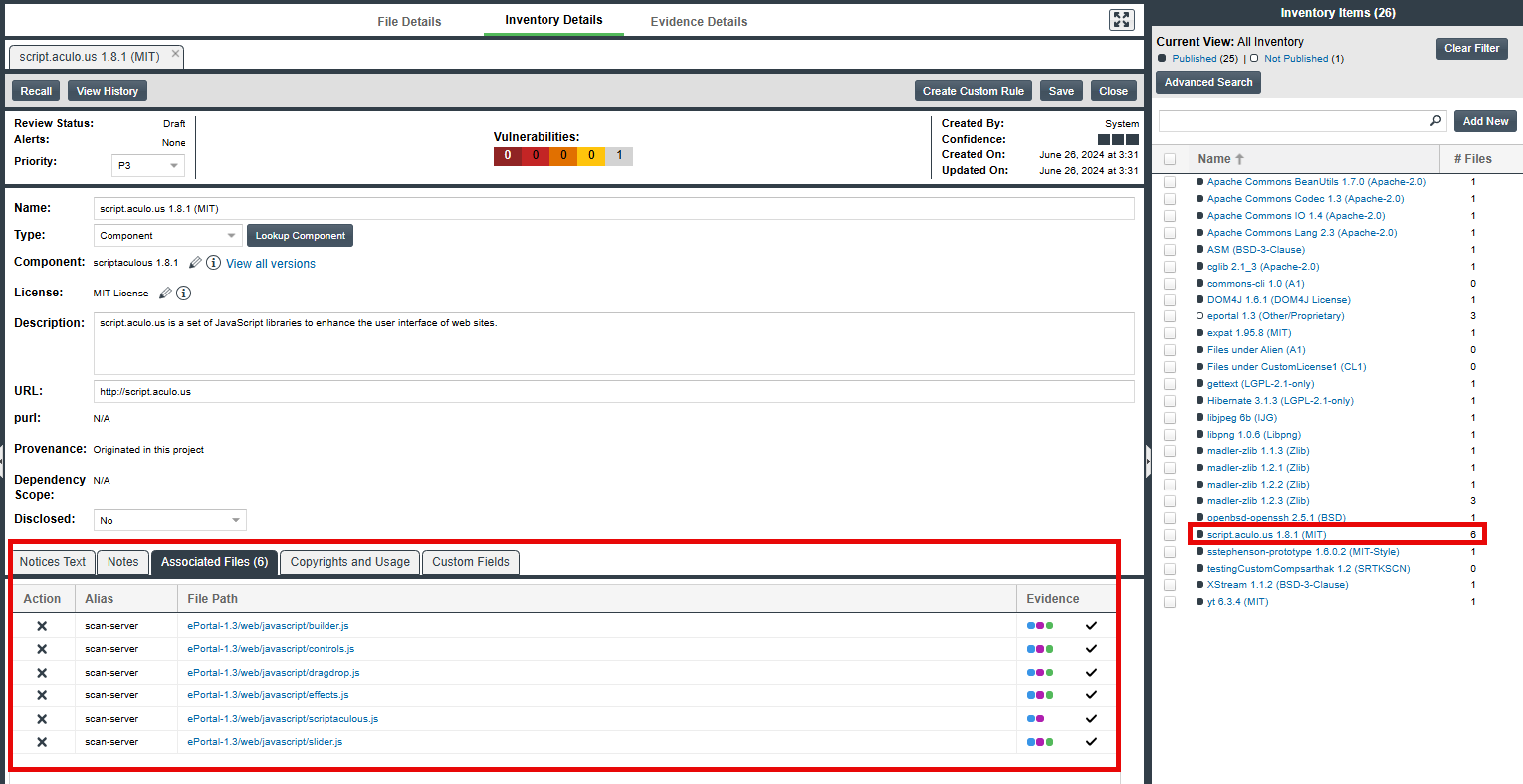 Within the Inventory Details tab for the inventory item, click the Associated Files tab to see all the files associated with the inventory item. (For more information about the file list and the options available on the Associated Files tab, see Viewing Files Associated with Inventory in the Analysis Workbench.)